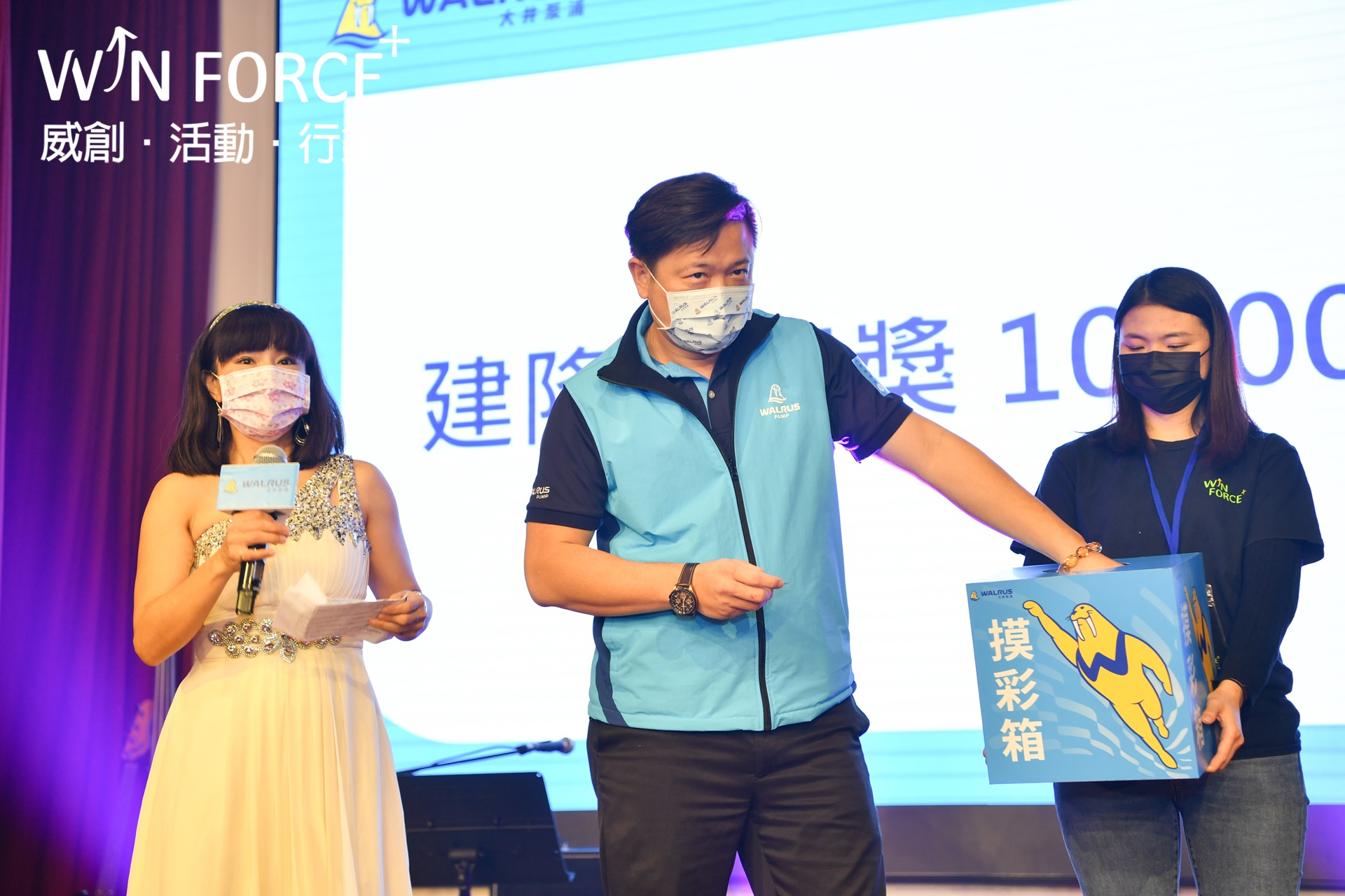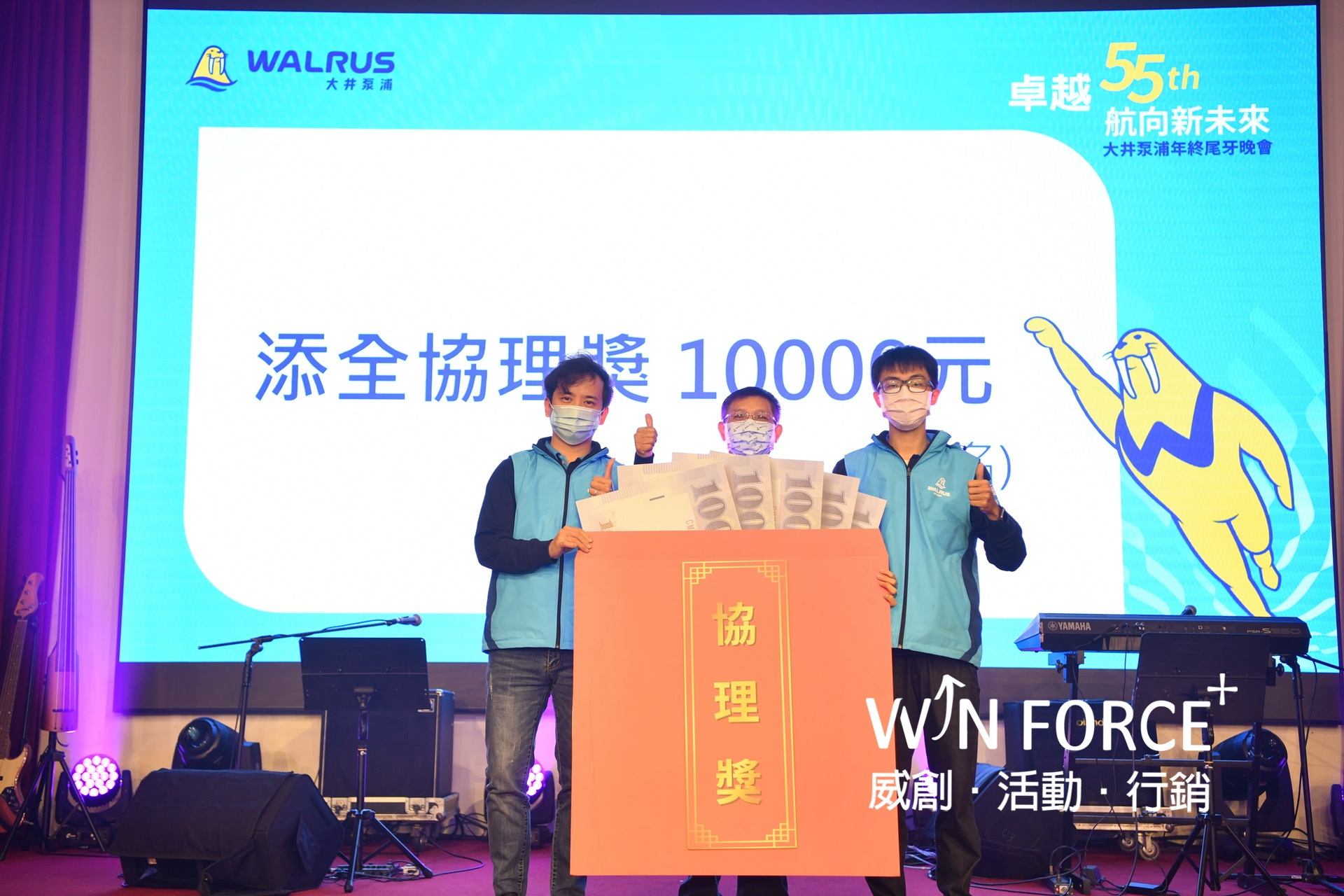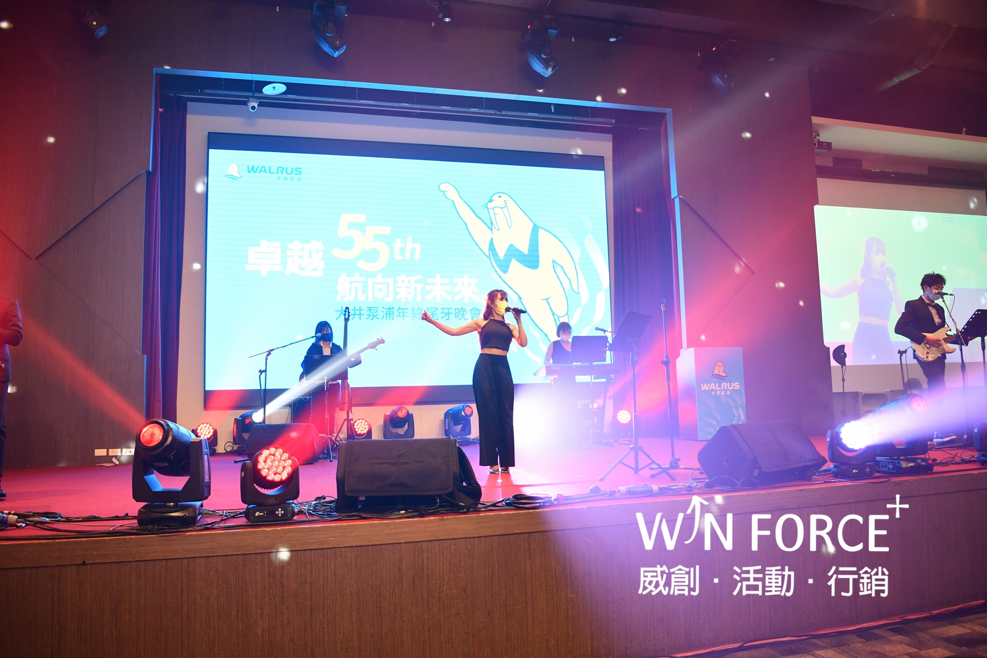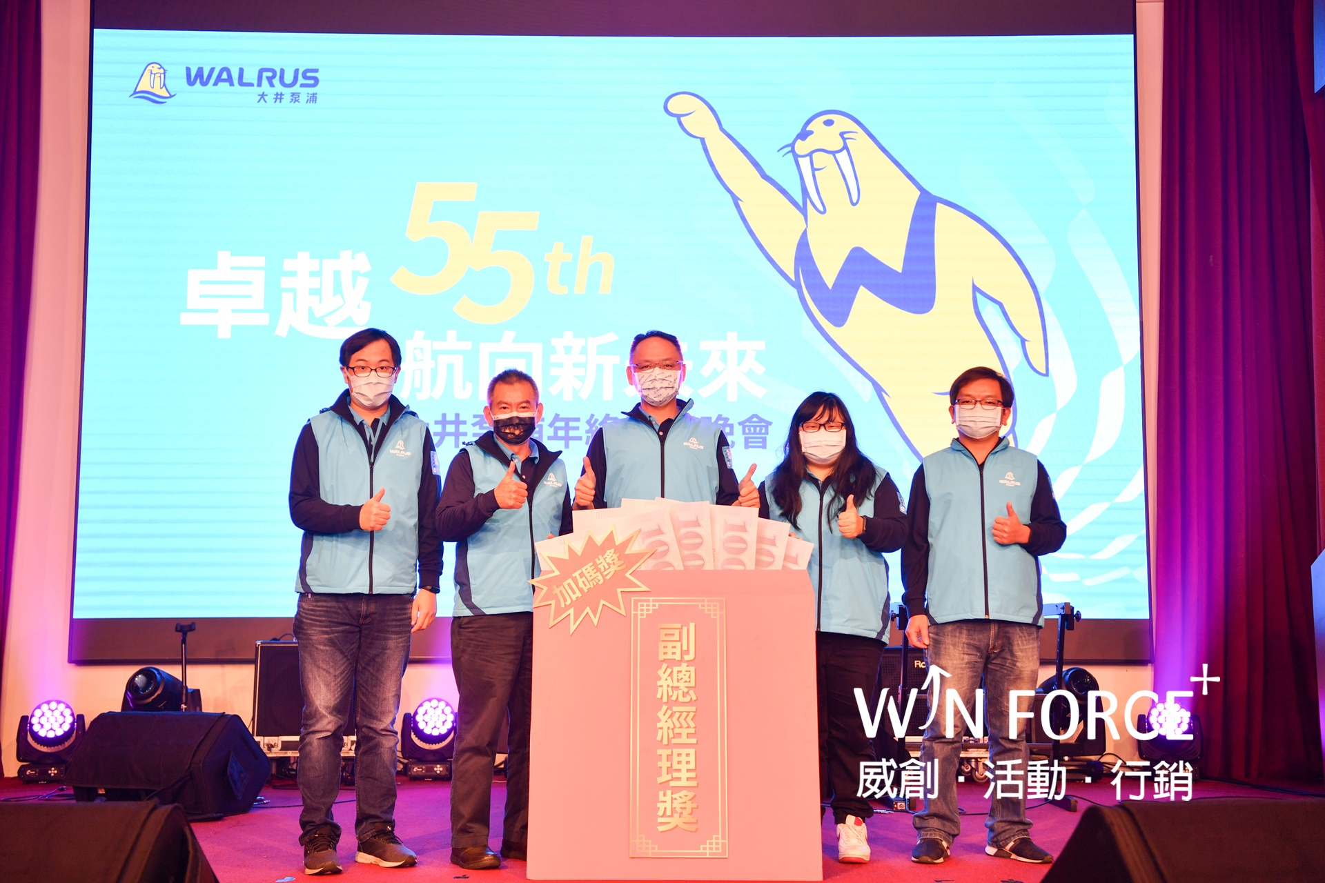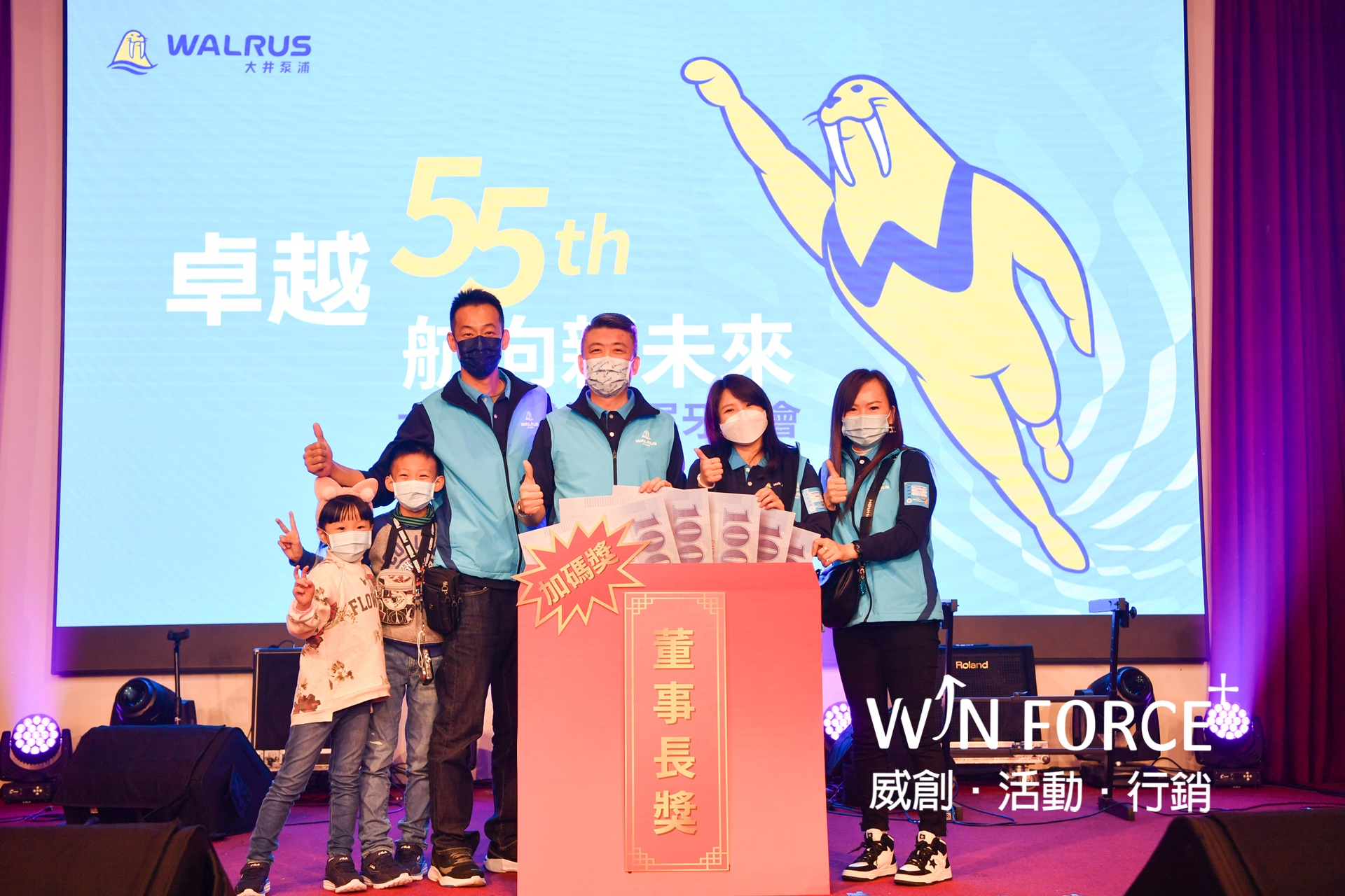 另外,也協力製作55周年里程碑影片、許多豐富、精彩的趣味暖場活動,以及頒獎典禮的大型頒獎牌,讓同仁留下最美好的受獎時刻。會場中搭配活動主視覺延伸設計製作物,不僅加強品牌氣度,漸層燈光效果更暈染出活動質感,激勵同仁未來也要持續共同乘風破浪、勇往直前。